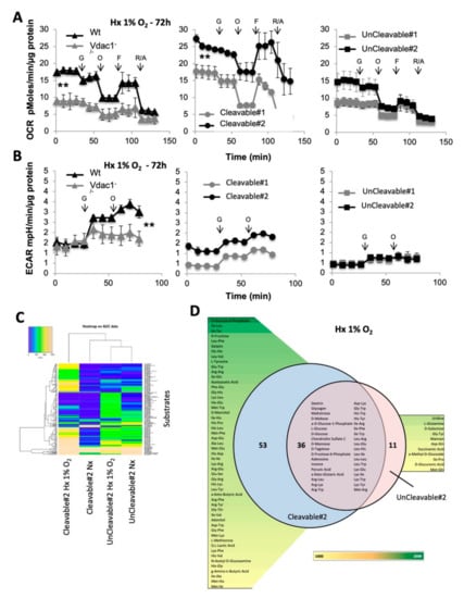 Metabolic characteristics of the cleavable and uncleavable forms of VDAC1 in 1% O2 hypoxia. (A) Respiratory control of Wt and Vdac1−/− cells (left panel), Cleavable#1/#2 (middle panel) and UnCleavable#1/#2 (right panel). OCR was measured in real time with the XF24 analyzer in Hx 1% O2. Cells were deprived of glucose for 1h, then glucose (G), oligomycin (O), FCCP (F), and Rotenone + Antimycin A (R/A) were injected at the indicated times. The mean ± SEM is representative of at least three independent experiments carried out in quadruplicate. (B) ECAR in Hx of Wt and Vdac1−/− cells (left panel), Cleavable#1/#2 (middle panel) and UnCleavable#1/#2 cells (right panel) was evaluated with the XF24 analyzer. Cells were deprived of glucose for 1 h, then glucose (G) and oligomycin (O) were injected at the indicated times. The mean ± SEM is representative of at least three independent experiments carried out in quadruplicate. (C) Heatmap showing the 160 substrates that were differently metabolized by Cleavable#2 and UnCleavable#2 in normoxia and hypoxia. The color key scale for each substrate is based on dye reduction quantified by Omnilog units. A yellow color indicates strong positive substrate metabolization, a green color moderate metabolization and a blue color indicates no substrate metabolization. Data area under the curve (AUC) <500 have been excluded. (D) Venn diagram comparing metabolic phenotyping of Cleavable#2 and UnCleavable#2 in hypoxia. Data AUC > 750. ** indicates p < 0.005.