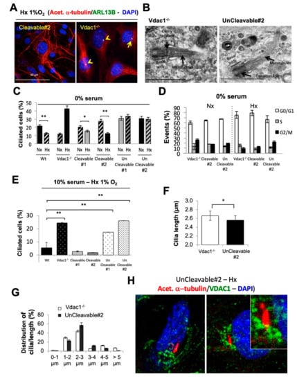 VDAC-ΔC drives the resorption of the primary cilium. (A) Immunofluorescence of acetylated α-tubulin (acet. α-tubulin in red), ARL13B (in green) and DAPI (in blue) in Cleavable#2 and Vdac1−/− cells in Hx 1% O2 for 72 h. (B) Representative electron micrographs of primary cilia of UnCleavable#2 cells incubated in normoxia (Nx). Axoneme (Ax), basal body, ciliary necklace, microtubules and transition fibers. (C) Quantitative analysis of the effect of Nx and Hx 1% O2 for 72 h on the ciliation percentage in the absence of serum (0% serum) in Wt, Vdac1−/−, Cleavable#1/#2, and UnCleavable#1/#2 cells assessed by confocal fluorescence microscopy (n = 100–300 cells). (D) Wt, Vdac1−/−, Cleavable#1/#2 and UnCleavable#1/#2 cells were incubated in Nx or Hx 1% O2 for in the absence of serum (0% serum). Cell cycle analysis was assessed by FACS. (E) Quantitative analysis of the effect of Nx and Hx 1% O2 for 72 h on the ciliation percentage in the presence of 10% serum in Wt, Vdac1−/−, Cleavable#1/#2, and UnCleavable#1/#2 cells as assessed by confocal fluorescence microscopy (n = 100–300 cells). (F) Average cilium length (µm) in Vdac1−/− (n = 100) and UnCleavable#2 (n = 58) cells was assessed by confocal fluorescence microscopy. (G) The distribution of the average cilium length (µm) in Vdac1−/− (n = 100) and UnCleavable#2 (n = 58) cells was assessed by confocal fluorescence microscopy. (H) Double staining and merge presentation of acetylated α-tubulin (acet. α-tubulin in red), VDAC1 (in green) and DAPI (in blue) in UnCleavable#2 cells in Hx 1% O2 for 72 h. * indicates p < 0.05 and ** indicates p < 0.005.