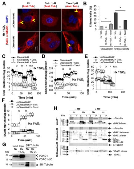 Destabilization or stabilization of the tubulin modified the percentage of primary cilium and metabolism, which was dependent on the cleaved form of VDAC1. (A) Immunofluorescence of acetylated α-tubulin (Acet. α-tubulin in red) and DAPI (in blue) in Cleavable#2 and UnCleavable#2 cells in the presence of colchicine (Colc.–1 µM) or taxol (1 µM) compared to the control (Ctl) in Hx 1% O2 for 72 h. (B) Quantitative analysis of the effect of the absence or presence of colchicine (Colc.–1 µM) or taxol (1 µM) for 72 h on the percentage of ciliation assessed by confocal fluorescence microscopy (n = 100–300 cells). (C) and (D) Respiratory control of Cleavable#2 (C) and UnCleavable#2 (D) in the presence of colchicine (Colc.) or taxol. OCR was measured in real time with the XF24 analyzer in Hx 1% O2. Cells were deprived of glucose for 1 h, then glucose (G), oligomycin (O), FCCP (F) and Rotenone + Antimycin A (R/A) were injected at the indicated times. (E) and (F) ECAR in Hx 1% O2 of Cleavable#2 (E) and UnCleavable#2 (F) in the presence of colchicine (Colc.) or taxol was evaluated with the XF24 analyzer. Cells were deprived of glucose for 1 h, then glucose (G) and oligomycin (O) were injected at the indicated times. (G) βIII Tubulin co-immunoprecipitating with VDAC1 in Wt cells in normoxia and hypoxia. (H) Pelleting assay for microtubule-associated proteins. Vdac1−/−, Cleavable#2 and UnCleavable#2 cells were incubated in the absence (−MT) or presence of taxol-stabilized microtubules (+MT). The amounts of VDAC1 and tubulin in the supernatant (S) and pellet (P) were analyzed by SDS-PAGE and immunoblotting. A * p < 0.05 and ** p < 0.005 show significant differences. The uncropped Western Blot figures in Figure S10.