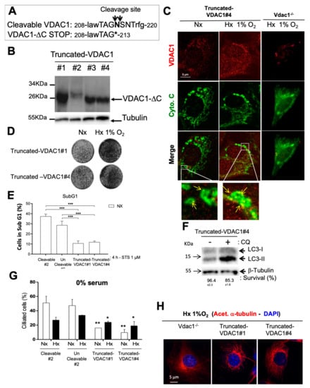 In order to obtain a cleaved form of VDAC1 in normoxia (i.e., a truncated isoform terminated at codon #214), a STOP Amber mutation was introduced in the cleavage site of human VDAC1 (Figure 5A). Plasmids expressing Truncated-VDAC1, which is similar to VDAC1-ΔC, were stably transfected into Vdac1−/− Ras MEFs. Four Ras MEFs clones expressing Truncated-VDAC1 (Truncated-VDAC1#1/2/3/4) were obtained and tested in normoxia for protein expression levels (Figure 5B). Only two of these clones were used and referred to as Truncated-VDAC1#1 and #4 cells. Truncated-VDAC1#1/#4 cells exposed to normoxia and hypoxia showed VDAC1 staining, enlarged mitochondria and enhanced growth in hypoxia compared to normoxia (Figure 5C,D and Figure S9A). Truncated-VDAC1#1/#4 cells, incubated with staurosporine (STS), exhibited little apoptosis in normoxia after 72 h compared to Wt or UnCleavable#2 (Figure 5E). Moreover, autophagy flux, using LC3-II expression, was observed in Truncated-VDAC1#4 cells in normoxia and cells were protected from cell death when CQ was added (Figure 5F). To further characterize the role of VDAC1-ΔC in ciliogenesis, primary cilia were counted in Truncated-VDAC1#1/#4 cells in normoxia and hypoxia (Figure 5G). Truncated-VDAC1#1/#4 cells showed less primary cilia than Cleavable#2 or UnCleavable#2 cells in both normoxia or hypoxia, in conditions where cell cycle was controlled and similar (0% serum—Figure 5G). Tubulin network was very spread out in the cytoplasm (Figure 5H). Together, these results directly proved for the first time that VDAC1-ΔC, per se, confers a survival advantage to Ras MEFs in addition to negatively regulate ciliogenesis.