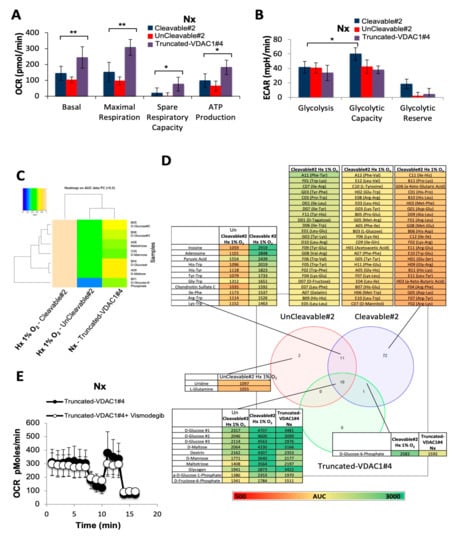 VDAC1-ΔC has a direct impact on metabolism in normoxia. (A) Respiratory control of Cleavable#2, UnCleavable#2 and Truncated-VDAC1#4. OCR was measured in real time with the XF24 analyzer in Nx. The mean ± SEM is representative of at least three independent experiments carried out in quadruplicate. (B) ECAR in Nx of Cleavable#2, UnCleavable#2 and Truncated-VDAC1#4 was evaluated with with the XF24 analyzer. The mean ± SEM is representative of at least three independent experiments carried out in quadruplicate. (C) Heatmap showing the 7 substrates that were communly metabolized by Cleavable#2, UnCleavable#2, and Truncated-VDAC1#4 in normoxia. The color key scale for each substrate is based on dye reduction quantified by Omnilog units. A yellow color indicates strong positive substrate metabolization, a green color moderate metabolization and a blue color indicates no substrate metabolization. Data area under the curve (AUC) < 500 have been excluded. (D) Venn diagram comparing metabolic phenotyping of Cleavable#2 in hypoxia, UnCleavable#2 in hypoxia and Truncated-VDAC1#4 in normoxia. Data AUC > 500. (E) Respiratory control of Truncated-VDAC1#4 in the presence of Vismodegib (50 µM). OCR was measured in real time with the XF24 analyzer normoxia (Nx). Cells were deprived of glucose for 1 h, then glucose (G), oligomycin (O), FCCP (F), and Rotenone + Antimycin A (R/A) were injected at the indicated times. (F) Graphical model. * indicates p < 0.05 and ** indicates p < 0.005.