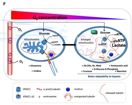 These results reinforce the role of the VDAC1-tubulin/microtubule interaction in the regulation of mitochondrial metabolism and highlight a putative direct relationship between the cilium, VDAC1-ΔC and, for the first time, cell metabolism.