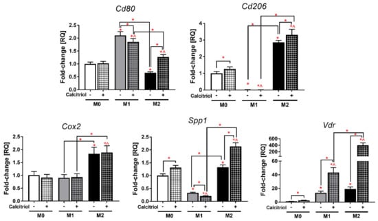Using real-time PCR, mRNA expression was analyzed for the genes characteristic of M1 (Cd80—CD80 Molecule) and M2 (Cd206—Mannose Receptor C-Type 1) macrophages as well as for other examined genes (Cox2—Cyclooxygenase 2, Spp1—Osteopontin, Vdr—Vitamin D Receptor).