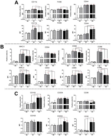 In the case of M1 macrophages, stimulation with calcitriol increased the expression of CD11b and MHC II (p < 0.05; 1.2- and 1.1-fold, respectively). However, we noticed a decrease in the percentage of the CD80+ population (p < 0.05; by 1.1%) and an increase in the percentage of the CD36+ population (p < 0.05; by 3.3%) in relation to M2 BMDMs.