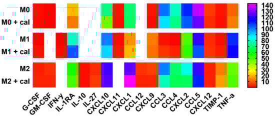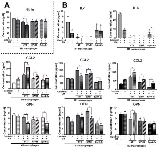 In addition, IL-1 was detectable only in M1 BMDMs (Figure 4C). All CM significantly lowered (p < 0.05) the concentration of this cytokine, and its level was undetectable when 4T1 CM was used in combination with calcitriol and 67NR CM was used with or without calcitriol (Figure 7).