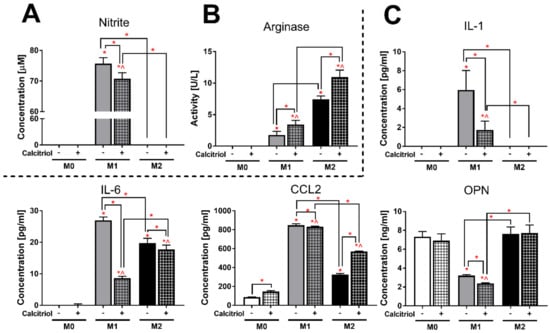 Interestingly, calcitriol significantly reduced the concentration of nitrite ions (Figure 4A) in M1 cultures (p < 0.05; 1.1-fold), but increased the arginase activity (Figure 4B) in both M1 and M2 cultures (p < 0.05; 1.9- and 1.5-fold, respectively). A significant decrease in the concentration of all tested cytokines (Figure 4C) was also noted in calcitriol-stimulated M1 BMDMs cultures (p < 0.05). In addition, calcitriol reduced the concentration of IL-6 in the supernatants of M2 BMDMs (p < 0.05; 1.1-fold), while an increase in CCL2 production was noted in M0 and M2 BMDMs (p < 0.05; 1.7-fold in both).