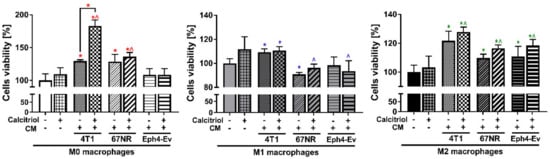 CM of 67NR cells, both alone and in combination with calcitriol, increased the proliferation of M0 (by 28.5% and 36.1%, respectively) and M2 BMDMs (by 9.7% and 16.5%, respectively), but inhibited the proliferation of M1 BMDMs (by 9.1% and 3.7%), compared to untreated BMDMs (p < 0.05; Figure 5).
