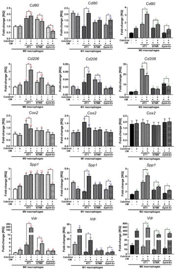 The expression of Spp1 mRNA was upregulated by each CM in M0 BMDMs (p < 0.05; average 2.4-fold; Figure 6), whereas in M1 BMDMs, a significant decrease in expression was observed (2.2-, 1.2-, and 1.7-fold for 4T1, 67NR, and Eph4-Ev, respectively). Furthermore, 4T1 and 67NR CM increased Cox2 gene expression (3.4- and 1.9-fold, respectively) in M2 BMDMs (p < 0.05). The expression of this gene was significantly increased (p < 0.05) by the combination of calcitriol with 4T1 CM and Eph4-Ev CM in M1 and M2 BMDMs and by the combination of calcitriol with 67NR CM in M2 BMDMs, whereas downregulation was caused by calcitriol combined with Eph4-Ev CM in M0 BMDMs (all comparisons to CM stimulation without calcitriol).