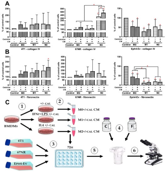 Effect of BMDMs of individual classes, differentiated with or without calcitriol, on the migration properties of normal and cancer cells: migration through (A) collagen type IV and (B) fibronectin. Both M2 BMDMs differentiated with and without calcitriol stimulated migration of 67NR cells through collagen IV, while M2+cal BMDMs increased 4T1 migration by fibronectin. The migration assay was repeated 4 times for each cell line. Statistical analysis: Sidak’s or Dunn’s multiple comparisons test. * p < 0.05 as compared to control or as indicated. The control cells were cells not treated with any BMDMs CM but only with serum-free DMEM (1:1 ratio). (C) The scheme of the experiment: (1) BMDMs were differentiated for 48h into different classes, with or without calcitriol. (2) Differentiated BMDMs were starved for 24 h in serum-free medium to generate conditioned media (CM). (3) Normal epithelial Eph4-Ev and cancer 4T1 and 67NR cells were seeded at the appropriate density in a 24-well plate and incubated with individual BMDMs CM in a 1:1 ratio (fresh medium/CM) for 72 h. (4) Membrane inserts (8 µm pore size) were coated overnight with a collagen type IV or fibronectin solution. (5) After incubation with BMDMs CM, cells were detached and seeded onto inserts (upper chamber). Migration was carried out for 8h in an incubator in the presence of FBS as a chemoattractant. (6) Cells that migrated to the other side of the insert membrane were fixed, stained, and counted under a light microscope.