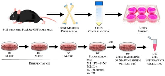To induce phenotype polarization, BMDMs were washed with PBS and transferred to a medium containing appropriate cytokines, with 50 ng/mL mouse recombinant IFN-γ (BioLegend, San Diego, CA, USA) and 100 ng/mL LPS (Sigma-Aldrich, Saint-Louis, MO, USA) for M1 BMDMs or 20 ng/mL mouse recombinant IL-4 for M2 BMDMs. The control was M0 BMDMs without additional stimulating factors. Calcitriol (Cayman Chemical, Ann Arbor, USA) was added simultaneously with appropriate cytokines at a concentration of 100 nM, and polarization was carried out for 48 h. Then, differentiated BMDMs were washed with PBS and used for further analysis. The isolation of bone marrow progenitor cells and their differentiation toward macrophages is shown in Figure 9.