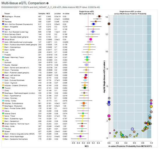GTEx multi-tissue eQTLs analysis of association between rs10815225 C allele and PD-L1 expression.