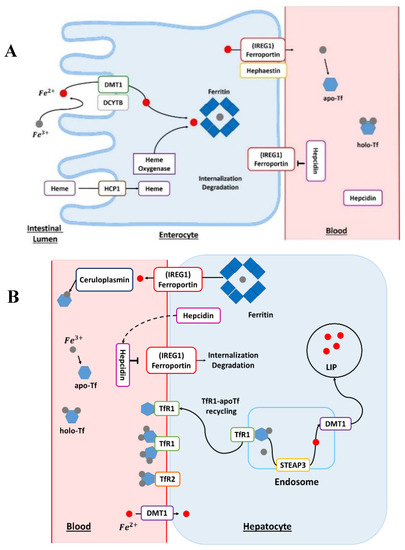 (A): The enterocyte: absorption site of dietary heme and non-heme iron. The Fe in the diet is mainly in the form of ferric Fe (Fe3+). Before its absorption into the enterocyte, Fe is reduced by the action of a reductase, such as duodenal cytochrome b (DCYTB). The ferrous Fe (Fe2+) subsequently enters the cell via the divalent metal transporter 1 (DMT1). Heme Fe is absorbed by the action of the heme carrier protein 1 (HCP1). The heme is degraded by the action of heme oxygenase and then ferrous Fe is released. The Fe contained in the cell may be stored in ferritin-bound form or it may be delivered to the circulation by the action of ferroportin, also known as iron-regulated transporter 1 (IREG1). Before joining the systemic circulation, the Fe is oxidized by hephaestin; then, Fe binds to transferrin (Tf), which can bind two ferric atoms (Fe3+). apo-Tf, apotransferrin; holo-Tf, holotransferrin. (B): The hepatocytes: principal storage site of iron. In blood, transferrin-bound Fe binds to transferrin receptor 1 (Tfr1) at the plasma membrane. The transferrin receptor 2 (Tfr2) protein plays the role of an Fe sensor and contributes to Fe homeostasis. For the release of Fe into the cell, the complex transferrin–Fe and Tfr1 are endocytosed. In the endosome, ferric Fe is released from transferrin (Tf) and reduced to ferrous Fe (Fe2+) via the six-transmembrane epithelial antigen of prostate 3 (STEAP3) protein. The transferrin–Tfr1 complex joins the plasma membrane and transferrin can participate in further cycles of Fe absorption. The Fe2+ is transported out of the endosome by DMT1. This Fe is part of the active labile Fe pool (LIP) and participates in cellular metabolism. In the cell, Fe can also be stored in the ferritin. Iron can exit hepatocytes via ferroportin, also known as iron-regulated transporter 1 (IREG1). In blood, Fe2+ is reoxidized by plasma ferroxidase, known as ceruloplasmin, to allow loading onto the Tf. Ceruloplasmin is a copper-dependent ferroxidase, a major protein of copper homeostasis. Hepatocytes are regulators of Fe homeostasis via the secretion of the peptide hormone hepcidin. High levels of Fe cause the production and secretion of hepcidin in the blood. Hepcidin binds to ferroportin and this triggers its degradation. apo-Tf, apotransferrin; holo-Tf, holotransferrin.