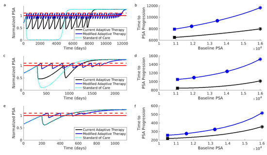 Simulations comparing current and modified adaptive therapy designs. The comparison was performed for three different types of patients. These patients differed in their initial resistance frequencies: low (Patient 1, Panels (a,b)), medium (Patient 2, Panels (c,d)), and high (Patient 3, Panels (e,f)). (a) Comparison for Patient 1 assuming that the initial baseline (solid red) cannot be increased. The modified design (blue) controls the PSA for longer than the current design (black). Both adaptive therapy designs are better than the standard of care (dotted light blue curve). To facilitate comparison, PSA progression for both designs occurs when the PSA exceeds of the baseline (dashed red). The PSA is normalized relative to initial baseline PSA. (b) Time to PSA progression for Patient 1 under the modified (blue) and current (black) adaptive therapy design. If the current design is implemented at the initial baseline indicated by the black square, the modified design implemented at the same baseline would improve the results (blue square). However, increasing the baseline by (leftmost blue circle) or (rightmost blue circle) improves the results further. Asterisks correspond to the dynamics shown in (a). (c,d) Same as (a,b) except for Patient 2. (e,f) Same as (a,b) except for Patient 3. Notice that Patient 3 did not achieve a reduction in the PSA during the first cycle of adaptive therapy (the black curve in Panel (e) is always above 0.5). This means that the current adaptive therapy design coincides with the standard of care (the black curve and dotted light blue curve in Panel (e) lie on top of each other). Simulations use the same mathematical model as the original simulations that supported the design of the current adaptive therapy regimen [13,47]. See Section 4 for details on patient types and simulations.
