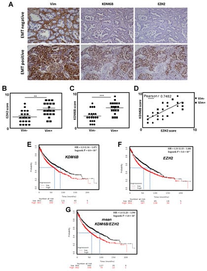 EZH2 and KDM6B expressions are correlated with EMT in NSCLC. (A) Representative IHC stainings of Vimentin (Vim, high score: EMT positive/low score: EMT negative), KDM6B, and EZH2 in 30 NSCLC (magnification × 100). (B) Quantification of the IHC EZH2 score regarding the EMT status. (C) Quantification of the IHC KDM6B score regarding the EMT status. (D) The correlation between EZH2 and KDM6B scores in NSCLC. (E) The KM-plotter for KDM6B expression showing the survival curves of patients with lung cancer classified in high expression (red) or low expression (black) groups. (F) The KM-plotter for EZH2 expression. (G) The KM-plotter for the mean of EZH2/KDM6B expression. ** = 0.005 < p < 0.01; *** = 0.001 < p < 0.005; **** = p < 0.001.