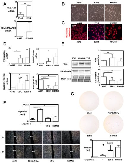 Next, we determined, using an EMT-inducible A549 cell model (using both TGFβ/TNFα), if the overexpression of EZH2 (pMSCV-EZH2-IRES-GFP) or KDM6B (pMSCV-JMJD3 expressing an HA tag) was able to induce EMT (Figure 2). Overexpression of both proteins in stable transfected cells (Figure 2A, Figure S2) did induce morphological changes characterized by a decrease in cell–cell adhesion and an increase in cell length (Figure 2B). Increased cell length was confirmed using phalloidin-rodhamin staining (Figure 2C). EZH2 and KDM6B overexpression also induced an increase in EMT markers at the mRNA level (Figure 2D) characterized by VIMENTIN, ADAM19 or MMP2 upregulation and a CDH1 decrease, as already described using a TGFβ/TNFα treatment. These effects were accentuated in cells overexpressing EZH2. Western-blot experiments show a significant Vimentin increase in cells overexpressing EZH2 and a decrease in E-Cadherin expression in cells overexpressing both EZH2 or KDM6B (Figure 2E). In order to clarify the role of these proteins on cancer phenotypes, we performed migration and invasion assays (Figure 2F-G). As expected, EZH2 and KDM6B overexpression increased these EMT-related phenotypes. To validate the role of EZH2 and KDM6B on EMT induction, we also performed transient transfection of HA-EZH2 and HA-KDM6B (Figure S3) and observed the same increase in EMT markers compared to the levels quantified in the untransfected control cells.