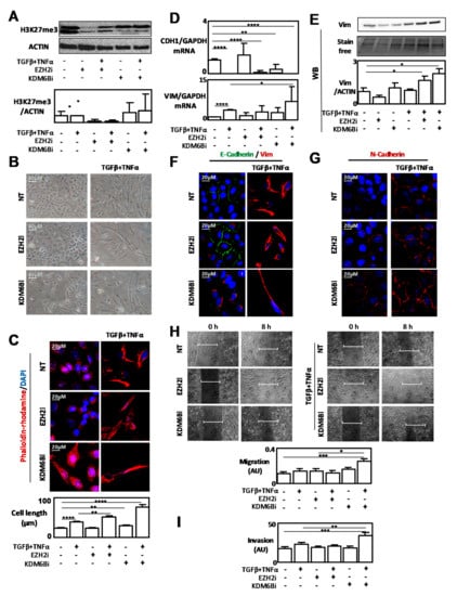 To clarify the roles of EZH2 and KDM6B during EMT, we modulated the expression and/or activity of these enzymes separately. As expected, both overexpression of EZH2 or KDM6B promoted Vimentin expression, a well-known EMT marker (Figure 2). Interestingly, the inhibition of KDM6B activity alone, using a specific inhibitor, was sufficient to promote EMT signaling (Figure 3). Nevertheless, the EZH2 or KDM6B inhibitor potentiated the effect of TGFβ/TNFα to induce EMT, and a more pronounced phenotype was observed when the activity of KDM6B was inhibited compared to the inhibition of EZH2. These data confirmed that the modulation (increase or decrease) of expression of each enzyme promoted EMT. Das and Taube [26] indeed highlighted the difficulty of addressing the precise contribution of these enzymes in a recent review.