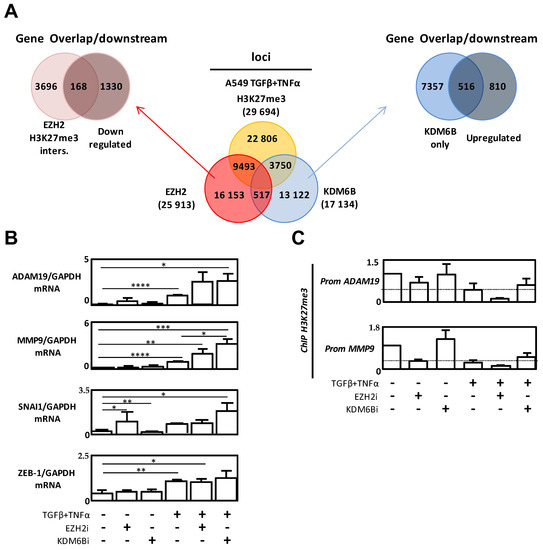 EZH2 and KDM6B regulated different genes during EMT. (A) Middle: Venn diagrams showing common and different DNA loci occupied by H3K27me3, EZH2, and KDM6B, and obtained following ChIP-seq experiments in A549 cells treated with TGFβ/TNFα. Left: A Venn diagram showing the intersection between genes co-occupied by H3K27me3 and EZH2 and down-regulated genes. Right: A Venn diagram showing the intersection between genes occupied by KDM6B alone and up-regulated genes. (B) Quantification of ADAM19, MMP9, SNAI-1, and ZEB-1 expression levels using RT-qPCR in A549 cells treated with TGFβ/TNFα and/or EZH2i or KDM6Bi. (C) Quantification of the H3K27me3 content on ADAM19, MMP9 using ChIP in A549 cells treated with TGFβ/TNFα and/or EZH2i or TGFβ/TNFα and/or KDM6Bi, respectively. * = 0.01 < p < 0.05; ** = 0.005 < p < 0.01; *** = 0.001 < p < 0.005; **** = p < 0.001.