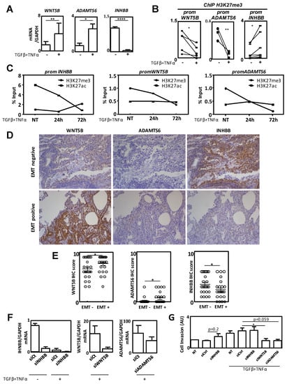 We next wondered whether our targets were directly involved in EMT-related phenotypes following the invalidation of INHBB, WNT5B, and ADAMTS6 using specific siRNAs (Figure 5F). Interestingly, the invalidation of INHBB expression, without the use of an EMT inducer, was sufficient to increase invasion (Figure 5G). As expected, since a TGFβ/TNFα treatment completely abolished INHBB expression, no additive effect of the combination of siINHBB and TGFβ/TNFα could be observed. On the opposite, the combination of TGFβ/TNFα with a siWNT5B, or with a siADAMTS6, decreased invasion. These data strongly supported the idea that the invalidation of INHBB expression mediated by H3K27 methylation and the promotion of WNT5B and ADAMTS6 expressions mediated by H3K27 demethylation favored invasion during EMT. Altogether, our data demonstrated that INHBB, ADAMTS6, and WNT5B could be considered as three new EMT biomarkers, epigenetically regulated during EMT.