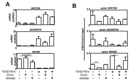 The effect of EZH2 and KDM6B inhibition on INHBB, WNT5B, or ADAMTS6 expression. (A) Quantification of WNT5B, ADAMTS6, or INHBB expression using RT-qPCR in A549 cells treated with TGFβ/TNFα and/or EZH2i or KDM6Bi. (B) Quantification of H3K27me3 content in WNT5B, EZH2, or KDM6B promoters using ChIP, in A549 cells treated with TGFβ/TNFα and/or EZH2i or TGFβ/TNFα and/or KDM6Bi. * = 0.01 < p < 0.05; ** = 0.005 < p < 0.01.