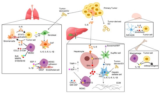 Proposed mechanisms by which various pro-inflammatory cytokines promote the formation of the pre-metastatic niche in different organs. Abbreviation: EV: extracellular vesicles; IL-6: interleukin 6; IL-1β: interleukin-1β; SDF-1 α: stromal cell-derived factor 1; IL-8: interleukin 8; VEGF: vascular endothelial growth factor; G-CSF: granulocyte-colony stimulating factor; CCL2: CC-chemokine ligand 2; CXCL1: C-X-C motif ligan 1; MIF: macrophage migration inhibitory factor; TIMP-1: tissue inhibitor of metalloproteinases 1; GM-CSF: granulocyte-macrophage colony-stimulating factor; SAA: serum amyloid A; TGF-β: transforming growth factor beta; FN: fibronectin; ECM: extracellular matrix; STAT3: signal transducer and activator of transcription 3; CAF: cancer associated fibroblast; MDSC: myeloid-derived suppressor cells.