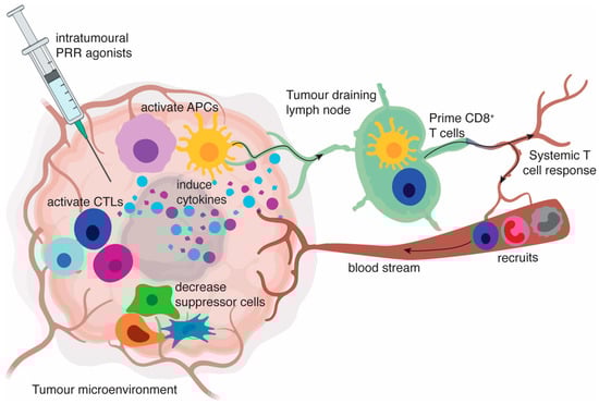 It is now recognised that a critical barrier to effective immunity against solid tumours is the local tumour microenvironment (TME), with its unique local milieu of immunosuppressive cells and hypoxia-induced factors that ultimately serve to limit the activity of infiltrating immune effector cells [,,]. By administering PRR agonists to the host, it is possible to deliver positive signals that can overcome some of these immunosuppressive networks [,,]. Furthermore, the administration of PRR agonists into an environment where APCs have captured tumour antigens can create an immunopermissive environment where antigen-specific adaptive responses can be initiated, or existing ones given an effective boost []. To maximise the likelihood of stimulating appropriate antigen-loaded APCs, it may be necessary to introduce the PRR agonists directly into the TME. This can be achieved in some clinical situations by intratumoural administration, the focus of this review.