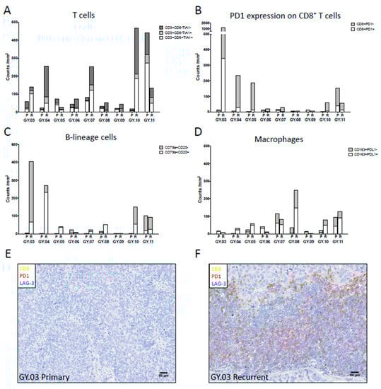 In general, recurrent tumor samples exhibited denser immune cell infiltrates compared to primary samples (Figure 1); only one patient (GY.11) showed decreased immune cell infiltration in the recurrent sample and one (GY.05) showed a mixture of increased and decreased infiltrated. In particular, recurrent tumors showed increased cytotoxic CD8+ T cells (CD3+CD8+TIA1+) and putative helper CD4+ T cells (CD3+CD8-TIA1−) (Figure 1A,E,F). The change in CD8+ T cell infiltration was mostly due to a higher number of PD1-negative CD8+ T cells (Figure 1B). Virtually no LAG3 expression was observed in any of the samples.