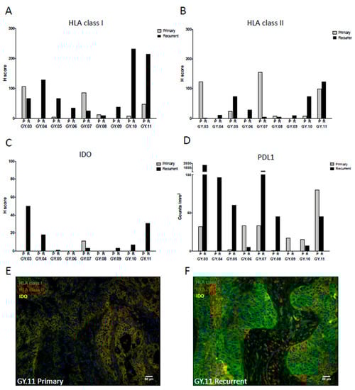 The expression of immune-modulating molecules on tumor cells in the TME of the primary (P) and recurrent (R) tumor samples were analyzed using multispectral immunohistochemistry (IHC) analysis or immunofluorescent IHC. (A–D) expression in primary tumor is presented in light grey and expression in recurrent tumor is presented in black. (A) Expression of HLA class I in the epithelial compartment of the TME. (B) HLA class II in the epithelial compartment of the TME. (C) Expression of IDO in the epithelial compartment of the TME. (D) Expression of PDL1 (CD163-PD1-PDL1+). (E,F) Example of HLA and indoleamine 2,3-dioxygenase (IDO) expression in primary (E) and recurrent (F) tumor tissue in patient GY.11. HLA class I in green, HLA class II in red, and IDO in yellow.