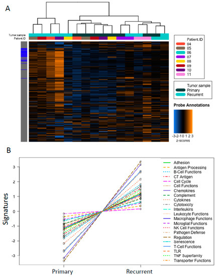 NanoString analysis of primary vs. recurrent tumor samples. (A) Heatmap showing all genes analyzed with NanoString technology. Samples are clustered together based on expression patterns. Gene expression levels are illustrated with a Z score. Orange indicates high expression; blue indicates low expression. (B) Illustrating the change in the pathway signatures from primary to recurrent tumors using nSolver software.