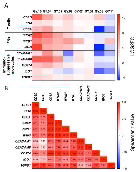 Using primary tumor as the baseline, the change in gene expression levels of T cell markers, interferons and immunosuppressive molecules were plotted in a heatmap to provide a graphical overview (Figure 4A). In 4/8 matched tumor samples (GY.04, GY.05, GY.09, and GY.10), recurrent tumors showed higher expression levels of genes related to interferons of T cells. In 6/8 cases, increased expression of CEACAM and PDL1 genes was seen (Figure 4A). The presence of a seemingly active T cell infiltrate paired with disease progression suggest underlying adaptive immune resistance mechanisms. Spearman correlation analyses supported these findings, showing strong positive correlations between the gene expression changes of T cell genes, interferons and the immunosuppressive molecules PDL1, TGFB1 and to some degree IDO and CEACAMs (Figure 4B).