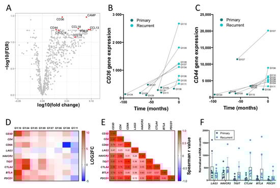 NanoString analysis of top upregulated genes in recurrent tumor compared to primary tumor samples. (A) Volcano plot showing Log2 fold change and the false discovery rate (FDR) using the primary tumor samples as the baseline. Illustration of expression of CD36 (B) and CD44 (C) over time (months from primary to recurrence). Statistical analysis was performed with a Wilcoxon test. (D–F) shows the expression of T cell marker genes and immune checkpoint genes. (D) Heatmap showing the log2 fold change values of the expression of selected genes from the primary and recurrent tumor samples. Red indicates high expression and blue indicates low expression. (E) Spearman correlation matrix with r values. Red indicates a strong positive correlation, blue indicates a strong negative correlation and white indicates no correlation. (F) Gene expression levels of immune checkpoints in primary and recurrent tumors. Statistical significance between expression levels in primary and recurrent samples was tested using multiple Wilcoxon tests. No significant changes were found with adjusted p values, false discovery rate (FDR), LAG3: p = 0.252, HAVCR2: p = 0.252, TIGIT: p = 0.224, CTLA4: p = 0.118, BTLA: p = 0.118, PDCD1: p = 0.224.