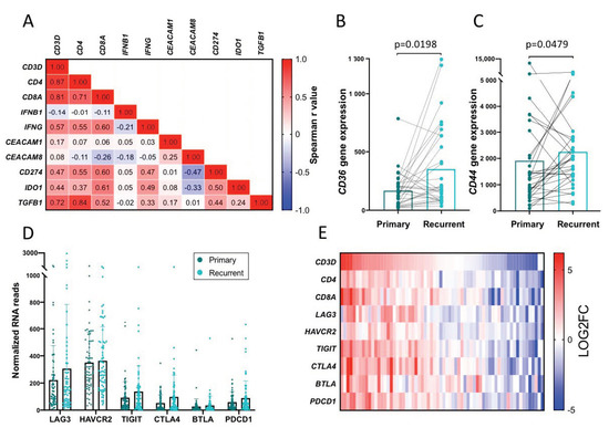 Validation of findings in an independent cohort of 66 patients with RNA seq data from primary and recurrent tumors described in Kreuzinger et al. [37] (A) Spearman correlation matrix with r values, from log2 fold change values of the expression of selected genes from the primary and recurrent tumor samples. Red indicates a strong positive correlation, blue indicates a strong negative correlation and white indicates no correlation. Validation of gene expression of CD36 (B) and CD44 (C). Figure (B,C) show patients with an increase in the T cell infiltration, with a log2 fold change >0.5 of the CD3D gene from primary to recurrent tumors. Statistical analysis was performed with a Wilcoxon test. (D) Gene expression levels of immune checkpoints in primary and recurrent tumors. Statistical significance between expression levels in primary and recurrent samples was tested using multiple Wilcoxon tests. No significant changes were found with adjusted p values, false discovery rate (FDR), LAG3: p > 0.999, HAVCR2: p > 0.999, TIGIT: p = 0.100, CTLA4: p = 0.057, BTLA: p = 0.100, PDCD1: p = 0.100. (E) Heatmap showing the log2 fold change values of the expression of selected genes from the primary and recurrent tumor samples. Red indicates high expression and blue indicates low expression.