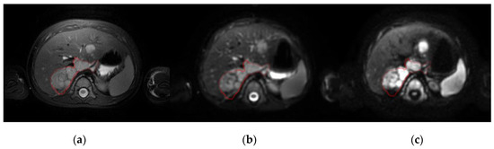 Baseline MRI of a patient with neuroblastoma in the right adrenal gland and liver metastasis shown on: (a), a T2-weighted image; (b), a DW image with b = 0 s/mm2; and (c), a DW image with b = 800 s/mm2 (right). The red line defines the primary tumor.