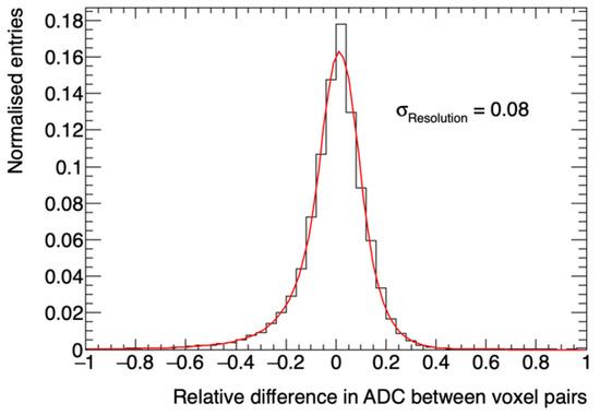 Relative difference in ADC between contiguous voxels calculated using a nearest-neighbor approach. The red line shows a double-sided Crystal Ball fit of the relative differences in ADC throughout the tumor.