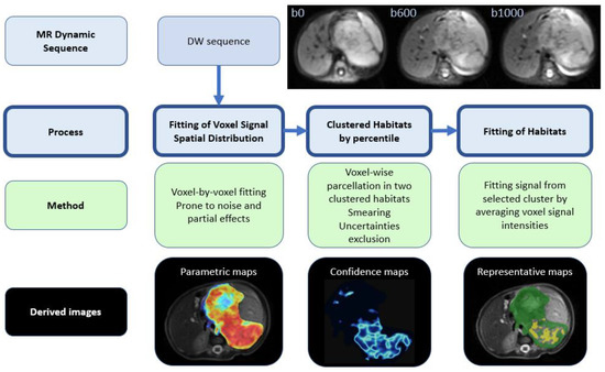As a result, here we designed a novel methodology to deal with these limitations. To overcome the problem of high tumor variability and the lack of generalizability, voxel uncertainty is quantified and voxels with lower confidence values are excluded, resulting in a selection of more homogeneous and representative tumor habitats that are independent of the problem under study. Moreover, and taking advantage of the results obtained in previous studies on ADC measurement techniques [25], the signal intensities of the voxels belonging to the lower ADC habitat are averaged and fitted in order to evaluate the robustness of performing a second fit on the signal intensities rather than averaging the voxel-based ADC values within these habitats.