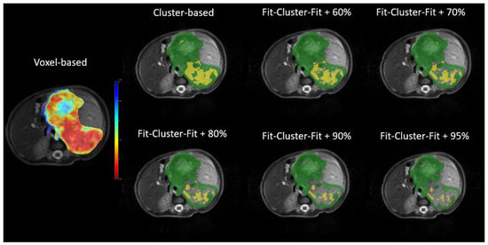 Representative maps for the ADC values in the voxel-based, cluster-based and Fit-Cluster-Fit models are shown in Figure 4 for the different confidence thresholds to exclude uncertainties (60%, 70%, 80%, 90% and 95%). Those voxels with low ADC values in the parametric map were mostly assigned to the lower ADC habitat in the respective representative maps. As the exclusion threshold increased, more high-uncertainty voxels were removed from their corresponding cluster, with the extreme scenario of encountering a few low-uncertainty voxels belonging to the most aggressive habitat.