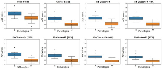 The box-and-whisker plots (Figure 5) show the distribution of the mean ADC values for benign and malignant neuroblastic tumors. These results are in agreement with the p-values obtained from the t-test, as the cluster-based and Fit-Cluster-Fit models showed a strong and similar distinction between benign and malignant tumors, as opposed to the voxel-based method. As a general trend, the interquartile ranges were lower with the Fit-Cluster-Fit methodologies when the confidence threshold to exclude uncertainties increased.
