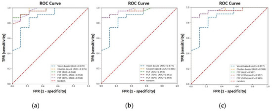 Receiver-operating characteristic (ROC) curves for voxel-based, cluster-based and Fit-Cluster-Fit models when applying different confidence thresholds (70% and 90%) to exclude uncertainties, and after performing a voxel-wise clusterization into two habitats with the (a) 5th, (b) 10th and (c) 15th percentiles as the parcellation thresholds.