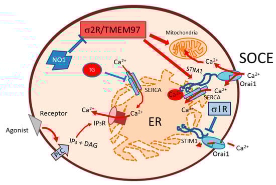 - Srivats, S.; Balasuriya, D.; Pasche, M.; Vistal, G.; Edwardson, J.M.; Taylor, C.W.; Murrell-Lagnado, R.D. Sigma1 receptors inhibit store-operated Ca2+ entry by attenuating coupling of STIM1 to Orai1. J. Cell Biol. 2016, 213, 65–79. [Google Scholar] [CrossRef] [PubMed]