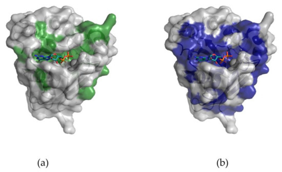 Evolutionary conservation of Rab GTPase proteins. (a) The surface representation of Rab1a crystal structure (green) from Homo sapiens (PDB ID: 4FML) shows residues that are fully conserved across all human Rab proteins (PDB IDs: 3TKL, 6IF2, 5LPM, 2IL1, 1X3S, 1Z0F, 2A5J, 2P5S, 6HUF, 1YZT, 2FG5, 1Z22, 4QXA, 2F7S, 20CB, 3TS0); (b) Residues that are 100% conserved across Rab1a proteins from multiple species (mouse, rat, wolf, human, pig, thale cress, slime mold, great pond snail) are shown in blue.