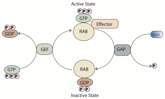Schematic representation of the Rab GTPase cycle. Rab proteins oscillate between an active guanosine triphosphate (GTP)-bound state and an inactive guanosine diphosphate (GDP)-bound state. The activation and inactivation is regulated by guanine nucleotide exchange factors (GEFs) and GTPase-activating proteins (GAPs), respectively. Rab proteins, in the active (GTP-bound) state promote downstream signaling through the interaction of effector proteins.