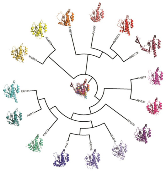 - Pereira-Leal, J.B.; Seabra, M.C. Evolution of the rab family of small GTP-binding proteins. J. Mol. Biol. 2001, 313, 889–901. [Google Scholar] [CrossRef]