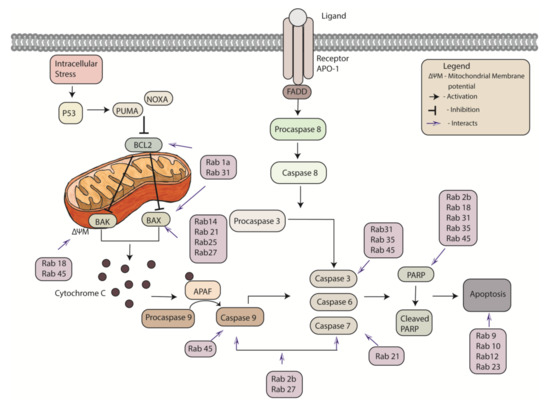 Evading apoptosis is a key hallmark of cancer, which enables cancerous lesions to proliferate and survive without being eliminated. The focus of this section is to review Rab proteins that have pro- and anti-apoptotic functions (Figure 3) and thus hold the potential to be exploited therapeutically.