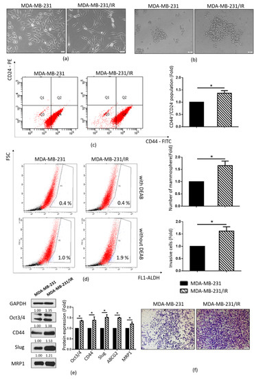 Characteristics of radioresistant MDA-MB-231/IR cells. (a) Morphologies of MDA-MB-231 and MDA-MB-231/IR cells cultured as monolayers (100× magnification). (b) MDA-MB-231 and MDA-MB-231/IR cells cultured as mammospheres in complete MammoCult Human Medium for 10 days (100× magnification). (c) CD44+/CD24− population in MDA-MB-231/IR and MDA-MB-231 cells as analyzed by fluorescence-activated cell sorting (FACS). (d) ALDH+ population assessed by the ALDEFLUOR assay kit, with DEAB used as the negative control. (e) Cancer stem cell (CSC) markers were analyzed by Western blotting; * p < 0.05; results are presented as the mean ± standard deviation. (f) Invasion of MDA-MB-231/IR and MDA-MB-231 cells assessed by the Transwell cell invasion assay (100× magnification).