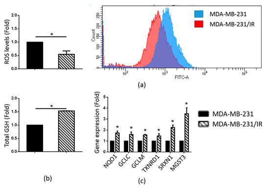ROS and GSH levels and expression of genes related to antioxidant effects in MDA-MB-231 and MDA-MB-231/IR cells. (a) ROS levels were evaluated after staining with H2DCFDA. (b) Total glutathione levels were measured by the GSH assay. (c) The expression of antioxidant-related genes was analyzed by real-time PCR; * p < 0.05; results are presented as mean ± standard deviation.