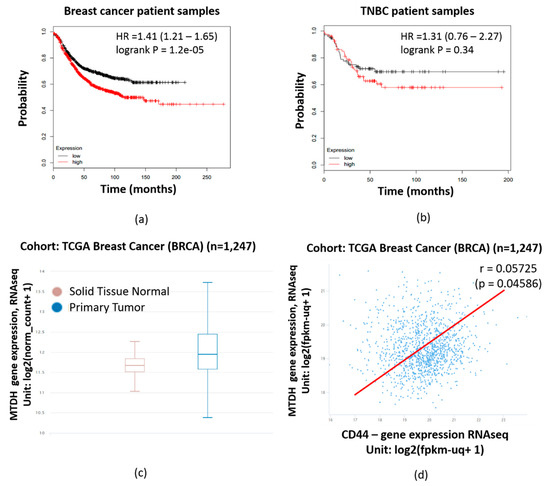 Kaplan–Meier plot analysis was performed to examine the correlation between MTDH expression and the survival rates of breast cancer and TNBC patients. Higher expressions of MTDH and shorter lifetimes were found to be correlated in breast cancer and TNBC patients, as shown in Figure 3a,b, respectively. Moreover, Xena browser analysis indicated a higher expression of MTDH at the mRNA level in primary tumor samples compared to normal tissue (Figure 3c) (n = 1247, p-value = 7.699 × 10−9, f = 18.97). Xena browser analysis also revealed a positive correlation between the MTDH and CD44 expression levels in The Cancer Genome Atlas (TCGA) breast cancer database (Figure 3d) (n = 1247, r = 0.05725, p-value = 0.04586). The positive correlation of MTDH with poor prognosis in breast cancer patients suggests that MTDH is an ideal target for chemotherapy.