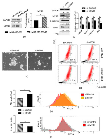 As MTDH has been reported to play a prominent role in breast cancer therapy resistance [33,39] and maintenance of the CSC population [31], we examined whether MTDH could play a role in the stemness of MDA-MB-231/IR cells. We found that MTDH was overexpressed (1.44-fold) in MDA-MB-231/IR cells compared to the parental MDA-MB-231 cells (Figure 4a). Figure 4b shows that the knockdown of MTDH resulted in a decrease in the MTDH protein levels (2.43-fold reduction) compared to the si-RNA control, and inhibition of MTDH expression in MDA-MB-231/IR cells resulted in reductions in mammosphere formation (Figure 4c) and ALDH activity (Figure 4c,d). These results were supported by decreases in CSC markers such as β-catenin and Slug (Figure 4b). Moreover, increased ROS production was observed (Figure 4e), as well as reductions in both total CD44 expression (Figure 4b) and CD44 expression on cell surfaces (Figure 4f) following the knockdown of MTDH. These results show that MTDH is responsible for the maintenance of the CSC population in MDA-MB-231/IR cells.