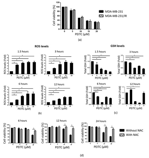 PEITC reduces cell viability in MDA-MB-231/IR cells by increasing ROS levels. (a) Cell viability was assessed by the MTT assay. (b) ROS levels were analyzed after staining with H2DCFDA. (c) Total GSH levels were measured by a GSH assay. (d) Pre-treatment with NAC (10 mM) helped maintain the viability of MDA-MB-231/IR cells, as assessed by the MTT assay; * p < 0.05; results are presented as mean ± standard deviation.