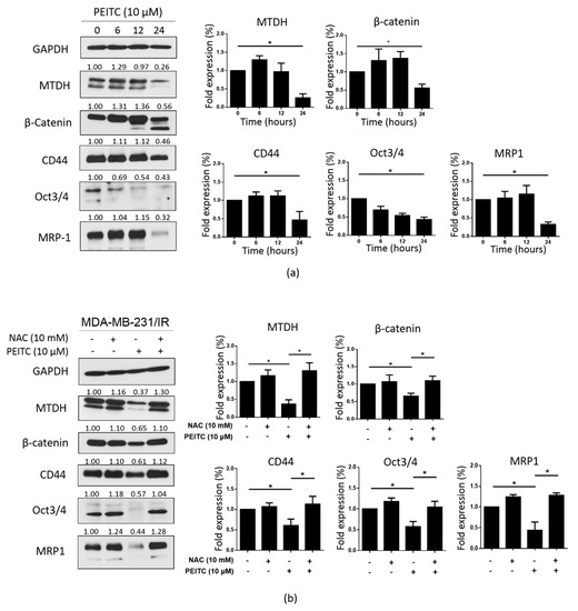 PEITC targets MTDH and CSC markers in MDA-MB-231/IR cells. (a) The levels of MTDH and CSC markers were assessed by Western blotting following PEITC (0, 10 μM) treatment. (b) NAC pre-treatment helped maintain the expression of MTDH and CSC markers; * p < 0.05; results are presented as mean ± standard deviation.