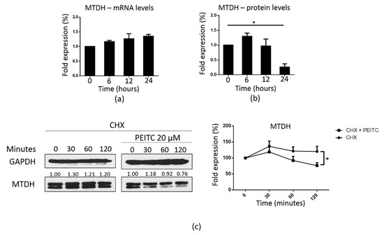 PEITC regulates MTDH post-transcriptionally. (a) Real-time PCR analysis of MTDH following PEITC treatment (10 µM for 6, 12, or 24 h). (b) Western blot analysis was performed to analyze MTDH expression following PEITC exposure (10 µM for 6, 12, or 24 h), similar to Figure 7a. (c) Western blot analysis of the MTDH protein expression following co-treatment with PEITC (20 µM) and cycloheximide (100 μg/mL) for 30, 60, or 120 min; * p < 0.05; results are presented as mean ± standard deviation.