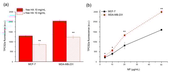CD44-mediated endocytosis of HA@TPCS2a-NPs. (a) Uptake of HA@TPCS2a-NPs (50 μg/mL NPs) in MDA-MB-231 and MCF-7 cells after 2 h of incubation at 37 °C in medium with or without 10 mg/mL of free HA. (b) Concentration-dependent uptake of HA@TPCS2a-NPs in MDA-MB-231 and MCF-7 cells after 24 h of incubation at 37 °C. Data are expressed as means ± SD of at least three independent experiments, carried out in triplicate; * p < 0.05, ** p < 0.001 (Student’s t test).